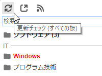 ツールバーの [更新チェック (すべての板)] ボタンを押すと、すべての板の更新チェックを行うことができます。更新チェックはスレッドごとではなく、板ごとに行われます。各板のスレッド一覧 (subject.txt) を取得し、スレッドのレス数を調べる仕組みです。 |