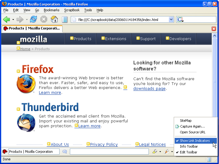 As with Bookmarks, we can access to saved page from the Firefox menubar. Unfortunately, drag-and-drop and right-click are not supported in ScrapBook menu. |